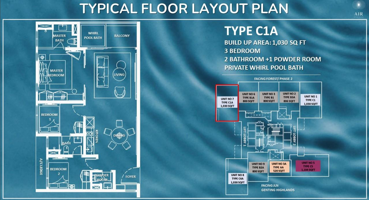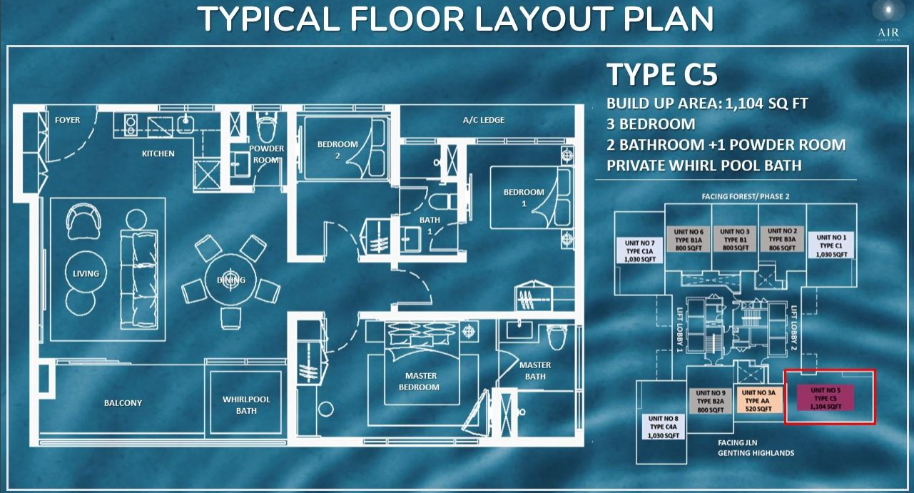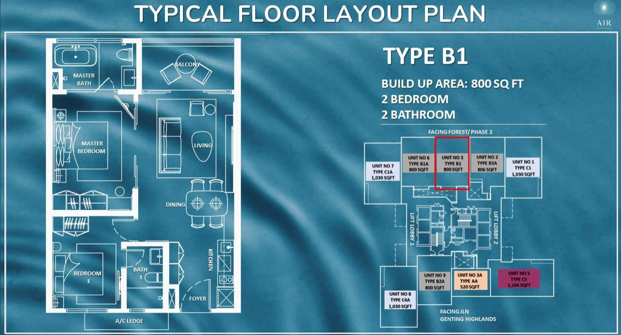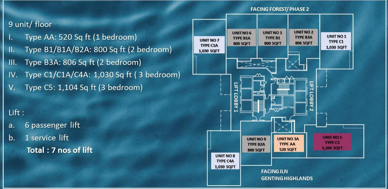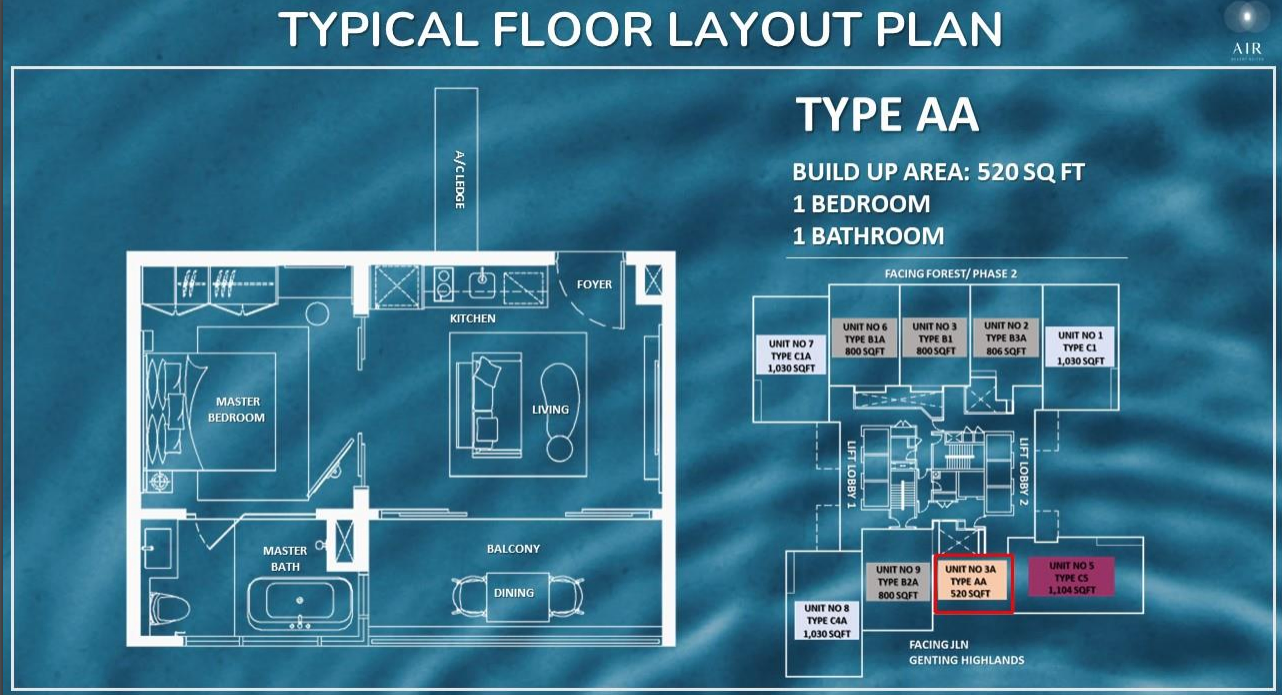 Project Name: Air Resort Suite @ Antara, Genting Highland. Location: Genting Highlands. Developer: Aset Kayamas. Land Tenure: Freehold. Land Title: Commercial Title Under HDA. Status Of Block A&B: Block A 374 Unit & B 356 Units Are Sold Out. Status: Block C&D Block C 356 Units Are Available. Total Unit: 1460 units. No of Storey: 46 storey. Land Size: 5.345 acres. Size: 520 sq.ft. – 1104 sq.ft. Unit Type: Type A,Type B & Type C. Unit Per Floor: Only 9 units. No of Lift: 6 + 1 lifts. Facilities Floor: Level 1,2,3, 6, 3&13A,21 &22,31 &32,36 &37. Maintenance Fees: RM0.55+10% Sinking Fund Psf Construction Status: 70% completed